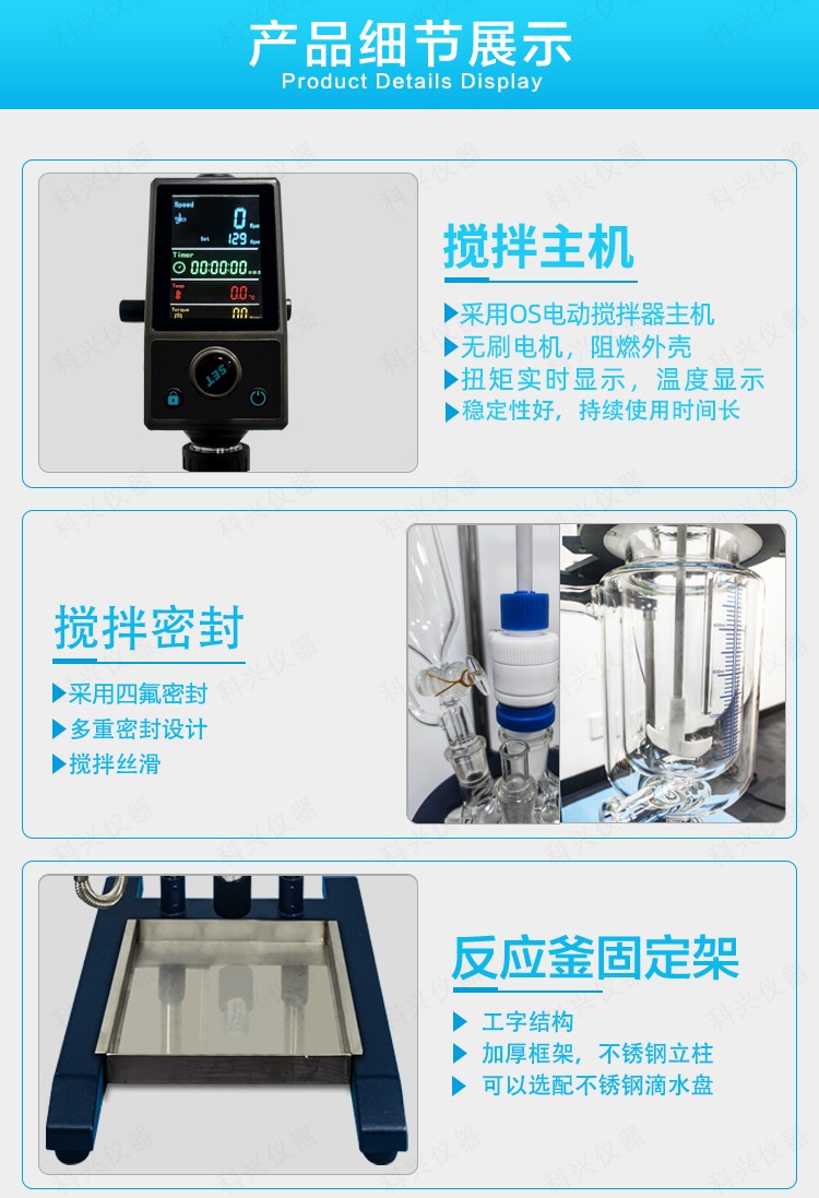 公司又根据客户具体使用环境做出1-5L小型玻璃反应釜升级款,采用我司OS-Pro系列搅拌器主机作为核心主机,一体大屏显示转速,定时,温度和实时的电机扭矩。